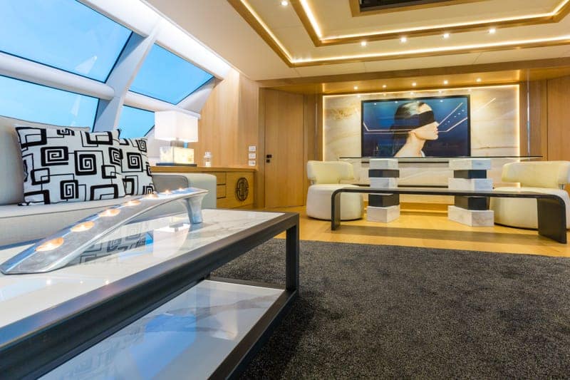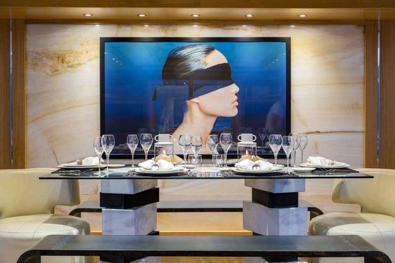 “Aquarella” is Greek for watercolor, so it seems a fitting name for a superyacht with such a colorful past. The 42-metre yacht was delivered in 1994 by UK yard Devonport and the 25 years since have followed a movie-worthy script. The saloon also features large windows that fill the space with natural light and a glass dining table for entertaining.