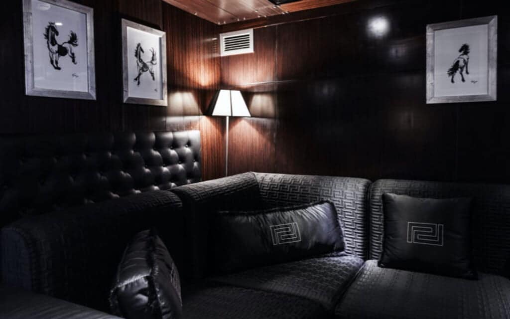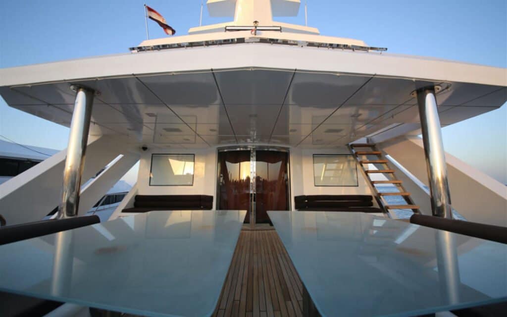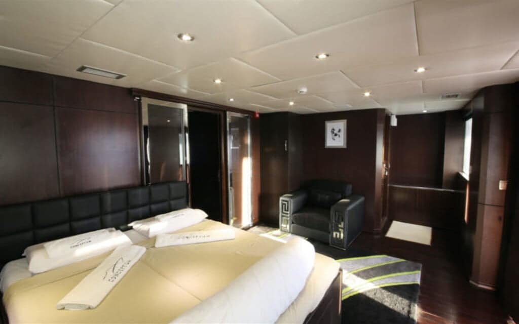 There is a commercial kitchen, a diving platform, On-board: restaurant, bar, water-pipe lounge, sauna, Jacuzzi, open-air cinema, luxury accommodation for 26 guests, 3 speedboats, collection of inflatables, slide, and a swimming pool. All cabins are carefully designed with natural wood, soft marine carpets, leather ceiling. Restrooms boast luxury shower cabins decorated with Italian mosaic tile.