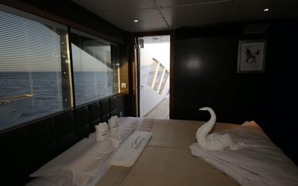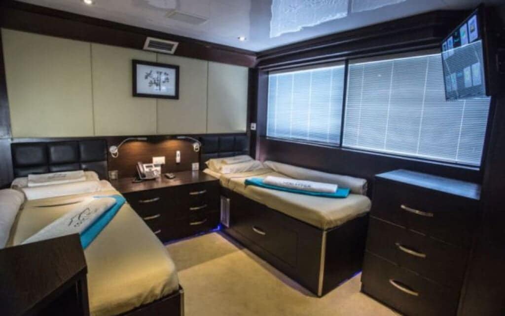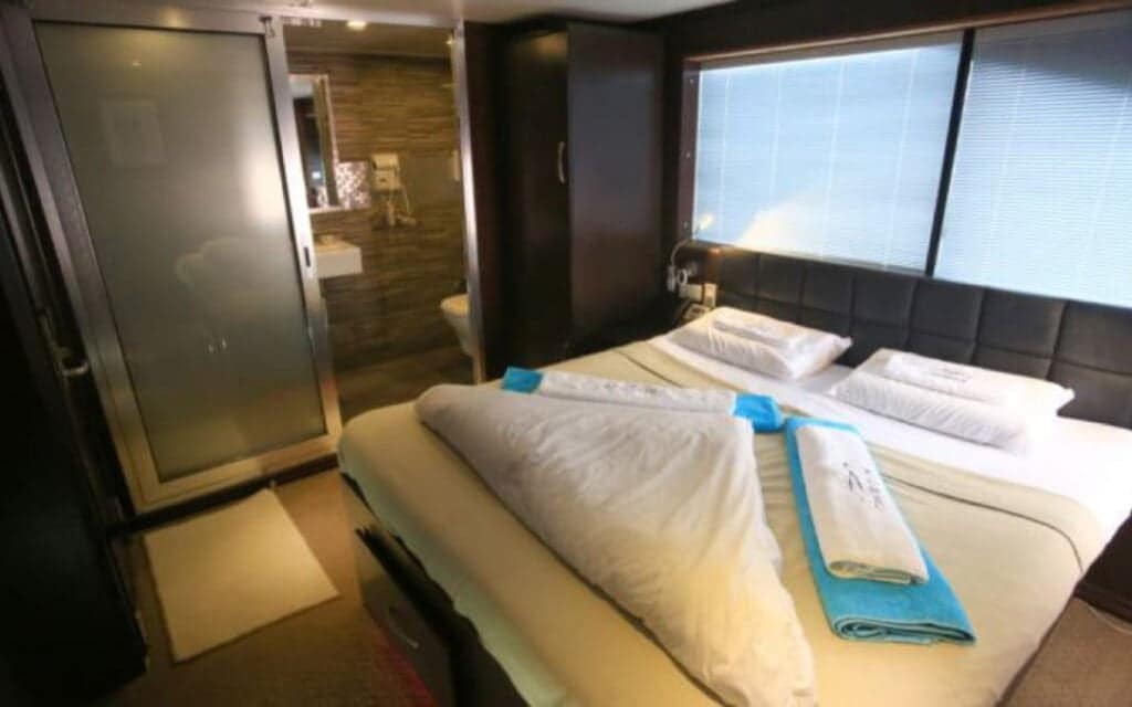 She has steel 3 decks on a steel hull with 14 cabins all with private bath. This vessel sets global benchmarks for design, engineering and onboard facilities. All guest rooms with air conditioning and private bathrooms.