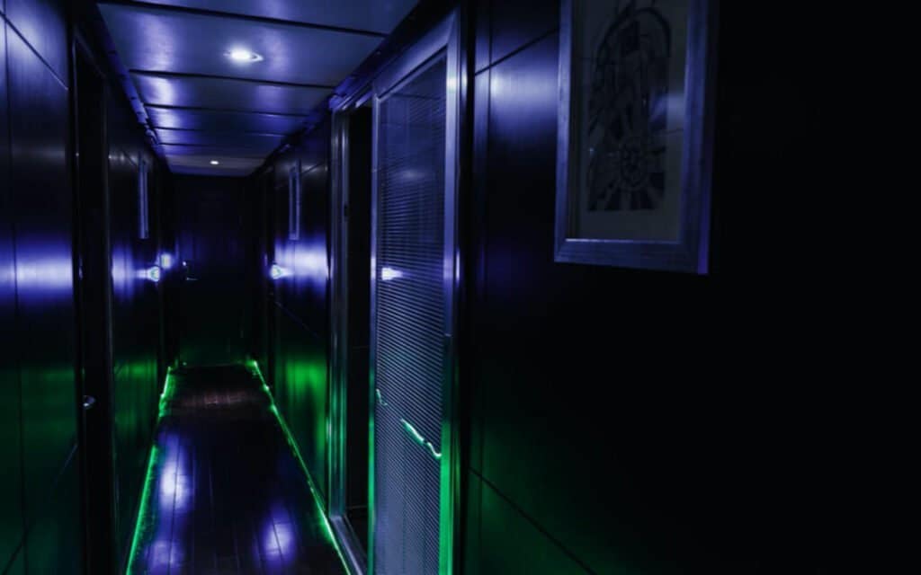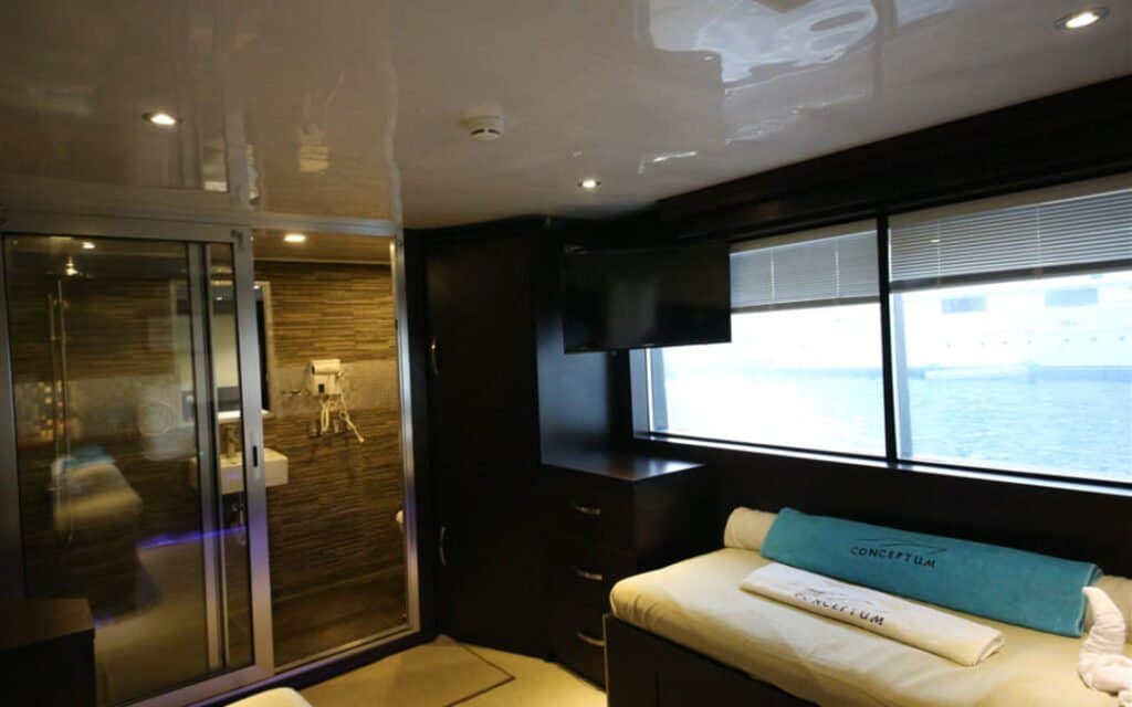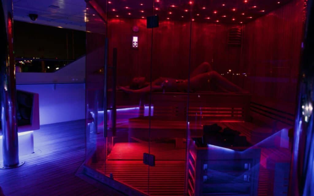 Every cabin has: individually controlled A/C, wide flat-screen TV with multimedia system, sound system, internal phone, fridge with minibar, safe box, hair dryer, panoramic windows with electric shutters, multi-color LED mood-lighting, ergonomic mattresses, ultra linen.