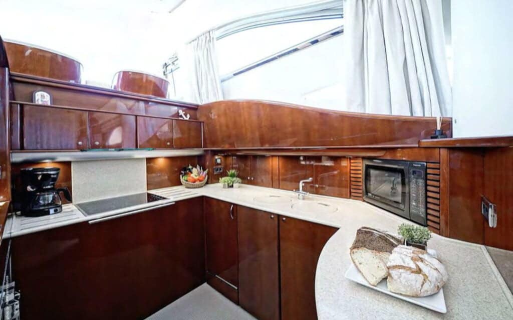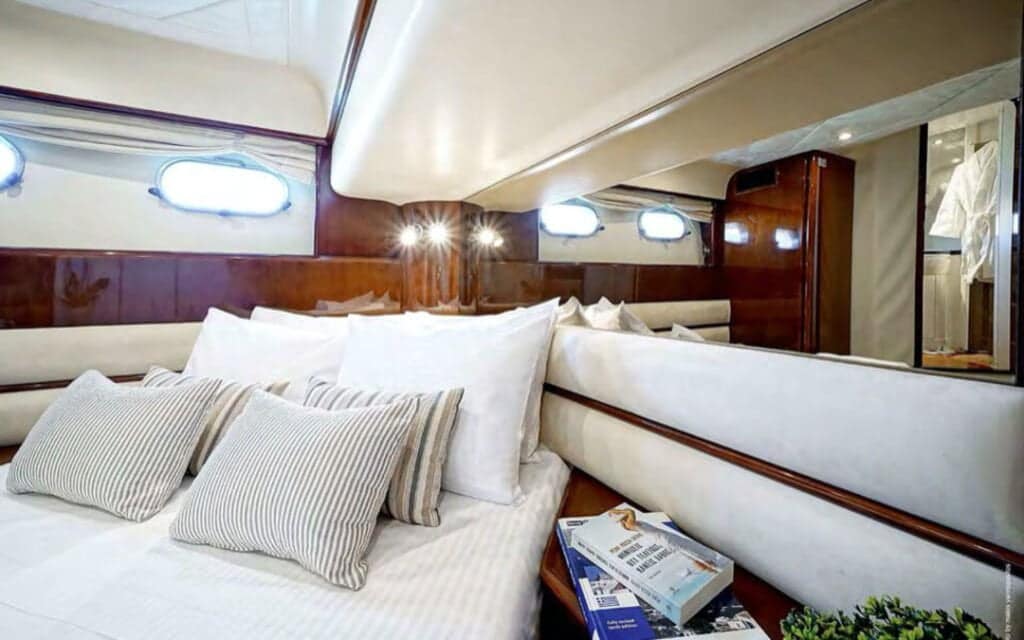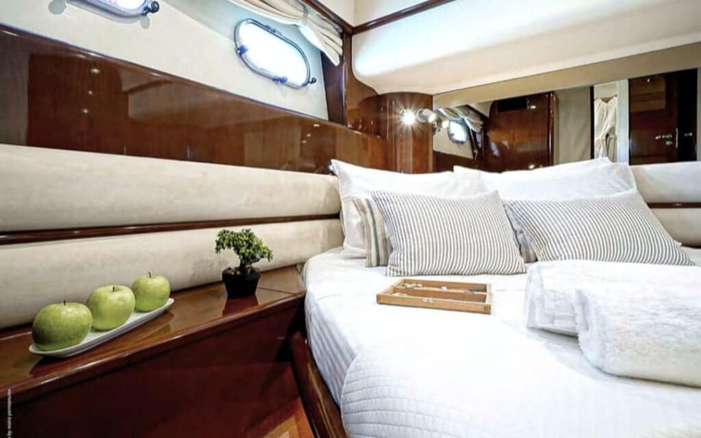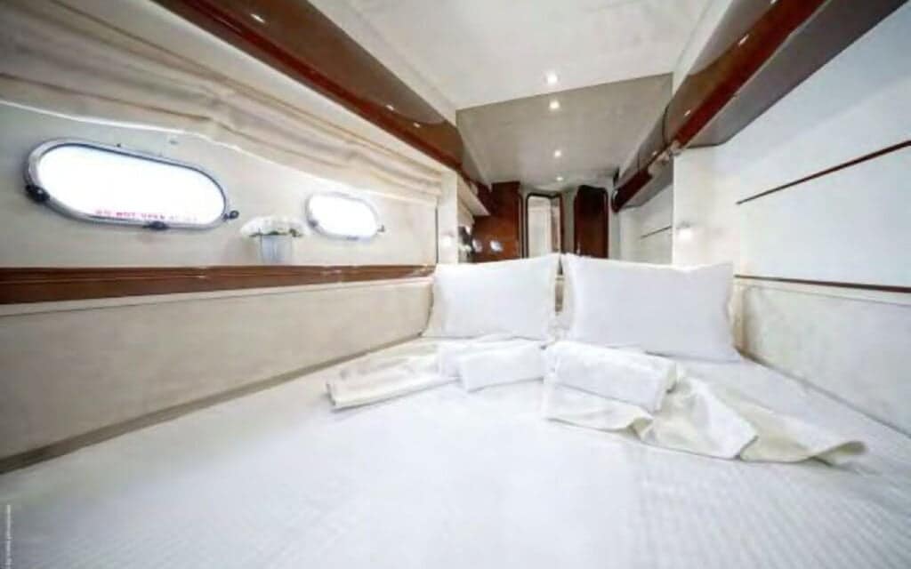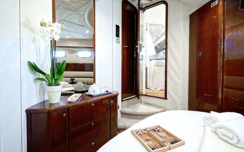 Step aboard the Princess 65′, and you’ll find a world where comfort meets style in perfect harmony. The yacht’s spacious deck provides an ideal setting for basking in the Mediterranean sun or enjoying the refreshing sea breeze. Inside, the tastefully designed interiors create an ambiance that complements Mykonos’s chic allure, ensuring your charter experience is nothing short of extraordinary.