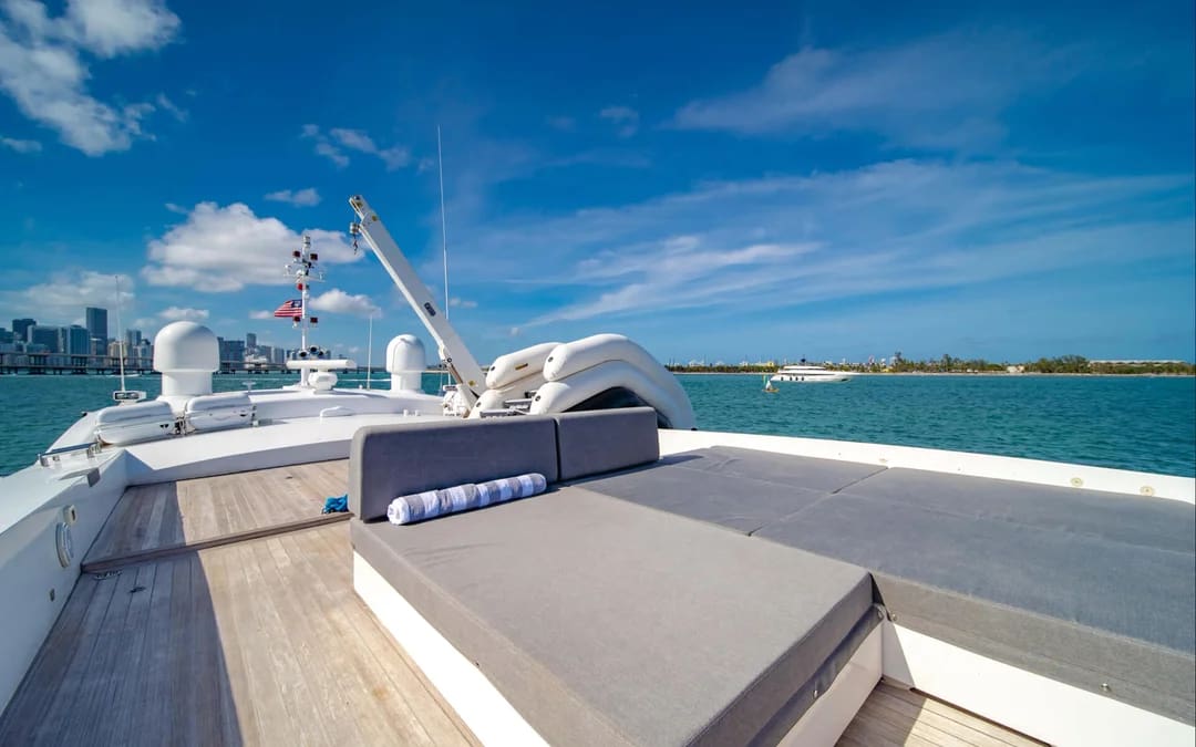 The 120' Tecnomar, one of the yacht charters in Miami, is a high-performance yacht with speed, luxury and minimalist elegance. With a cruising speed of 28 knots, island hopping in style and getting the most out of your itinerary is of no challenge for this gorgeous yacht. The aesthetic Italian interior design by Novulari - with light colors and touches of wood throughout. The innovative Sun Deck is the perfect place to lounge and acquire the desired golden suntan. She accommodates 12 guests for day charters and sleeps 11 in 5 staterooms; 1 Master full beam stateroom, 2 King guest VIP staterooms, 2 Twin guest cabins with enclosed en-suite heads.