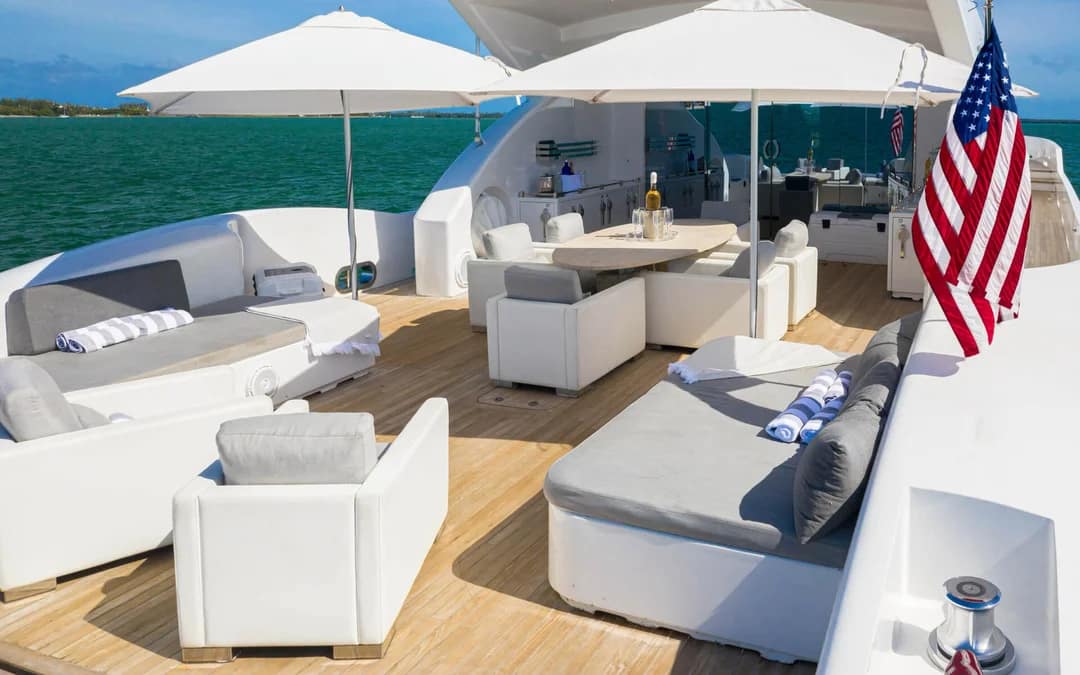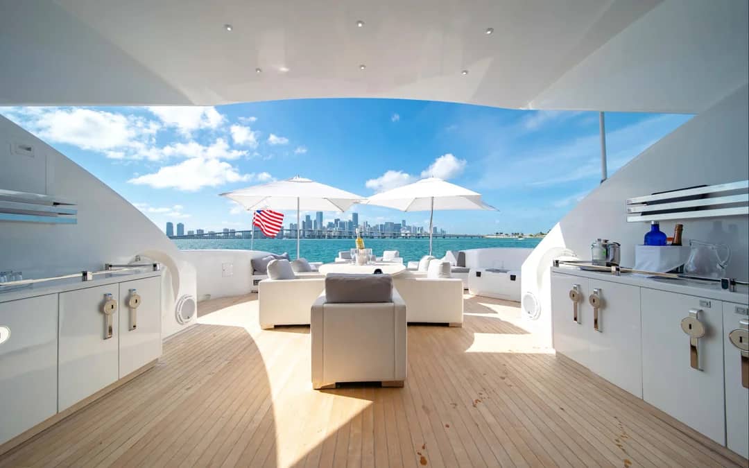 Tecnomar is one of the most amazing yacht charters in Miami. The 120′ Technomar is a high-performance yacht with speed, luxury and minimalist elegance. With a cruising speed of 28 knots, island hopping in style and getting the most out of your itinerary is of no challenge for this gorgeous yacht. The aesthetic Italian interior design by Novulari – with light colors and touches of wood throughout. The innovative Sun Deck is the perfect place to lounge and acquire the desired golden suntan. She accommodates 12 guests for day charters and sleeps 11 in 5 staterooms; 1 Master full beam stateroom, 2 King guest VIP staterooms, 2 Twin guest cabins with enclosed ensuite heads.